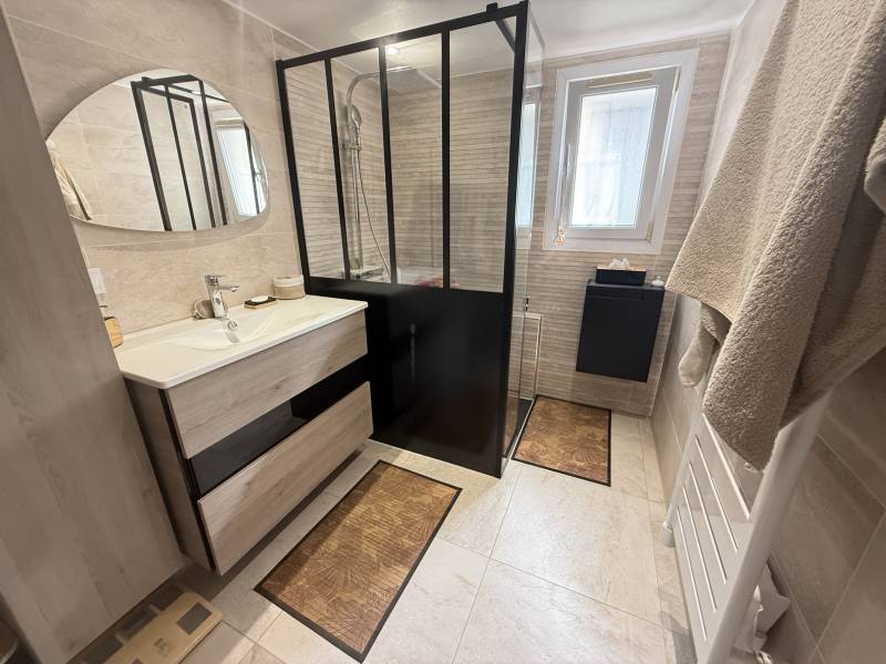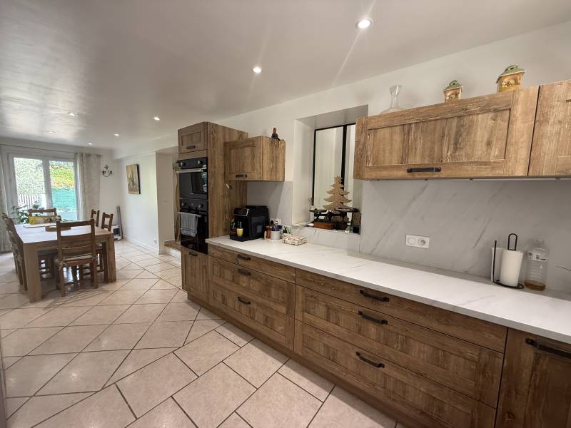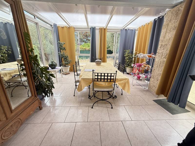 - Au rez-de-chaussée : un grand séjour lumineux avec cuisine équipée, une véranda pour profiter du jardin toute l’année, 2 chambres, une salle d’eau contemporaine et des toilettes.
