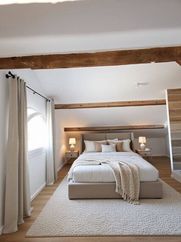 Au second niveau, sous les combles, se niche une chambre esprit studio avec sa douche, son toilette et son lave-mains. Une belle fenêtre en arc demi-cercle apporte charme et lumière, avec une vue agréable sur de jolies maisons récentes dans ce lotissement discret et harmonieux.