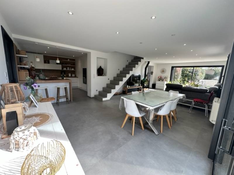 Le rez-de-chaussée se compose d'une entrée, d'une cuisine moderne - entièrement équipée (frigo - congélateur - lave-vaisselle - four à chaleur tournante et vapeur - micro ondes intégrés et plaque de cuisson avec aspiration centrale intégrée...) ouverte sur un grand séjour de 43 m2 bénéficiant de plusieurs ouvertures sur le jardin et la piscine, d'une suite parentale (avec grand dressing - coin bureau - chambre et salle d'eau avec douche à l'italienne), d'une buanderie, et d'un WC indépendant.