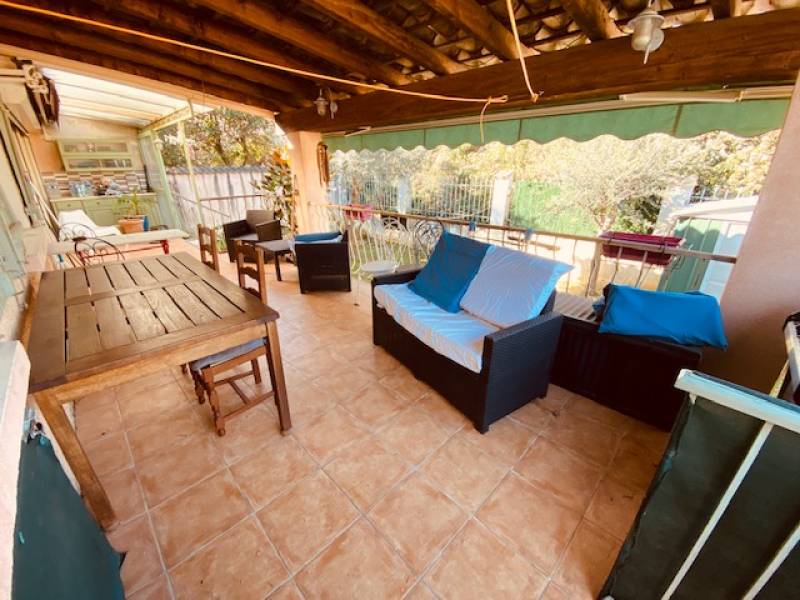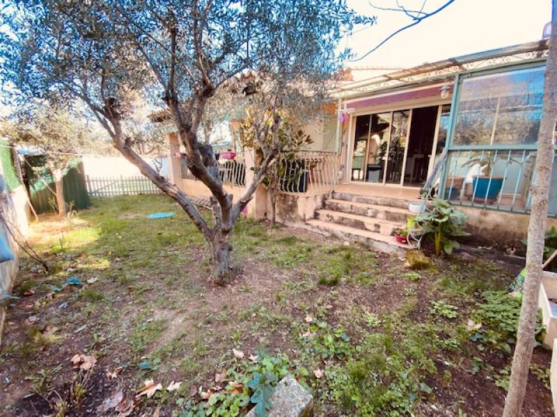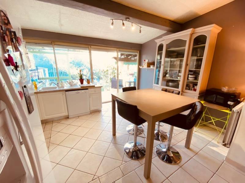 Cette maison dispose d’un terrain de 400 m2 avec une agréable piscine bien exposée, d’un coin jardin, des terrasses, de nombreux cabanons permettant de ranger le mobilier d’extérieur, des vélos…