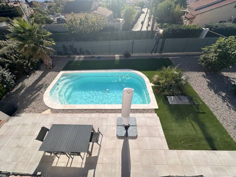 Piscine bien ensoleillée avec belle terrasse